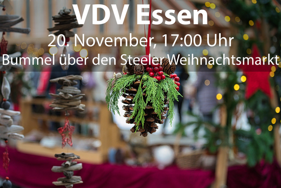 | | | |  | | | | | | | | | | Die Weihnachtszeit steht vor der Tür, und mit ihr die Gelegenheit, Freunde, Familie und auch VDV-Mitglieder auf dem Weihnachtsmarkt zu treffen. Steele startet wie immer früh in die Weihnachtsmarktsaison. Ich würde mich freuen, euch am Donnerstag 20.11.2025 um 17 Uhr in gemütlicher Runde auf einen Glühwein zu treffen. Im Anschluss können wir noch im Ypsilon einkehren und uns dort weiter… | | | | | | | |