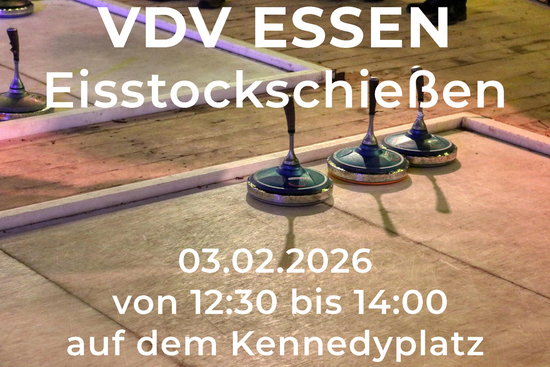 | | | |  | | | | | | | | | | Am Dienstag 03.02.2026 von 12:30 bis 14:00 Uhr ist auf dem Kennedyplatz eine Eisstockbahn für den VDV reserviert. Eine Bahn kann von 10 Spielern genutzt werden. Auf der Veranstaltungsfläche "Essener Wintertraum" steht ein umfangreiches gastronomisches Angebot bereit, wer sich sportlich nicht messen möchte, kann sich auch (in der Mittagspause) auf einen Glühwein oder Kaiserschmarn treffen. Nach… | | | | | | | |
