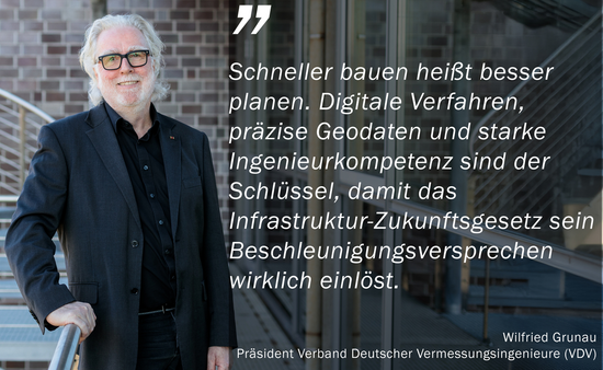 | | | | |  | | | | | | | | | | Anlässlich der öffentlichen Sachverständigenanhörung zum Infrastruktur-Zukunftsgesetz im Verkehrsausschuss des Deutschen Bundestages am 16. März betont der Verband Deutscher Vermessungsingenieure (VDV) die zentrale Bedeutung digitaler Planungsgrundlagen für eine schnellere Infrastrukturentwicklung in Deutschland. Mit dem Gesetzentwurf verfolgt die Bundesregierung das Ziel, Planungs- und… | | | | | | | |